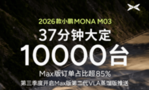 小鵬2026款MONA M03上市37分鐘,大定訂單即突破10000臺。