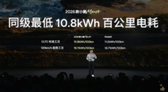 何小鵬也在現場介紹了2026款小鵬MONA M03的電耗表現,并曬出了和Model 3的電耗對比:2026款小鵬MONA M03 CLTC工況下百公里耗電量為10.8度,表現超過了Model 3。