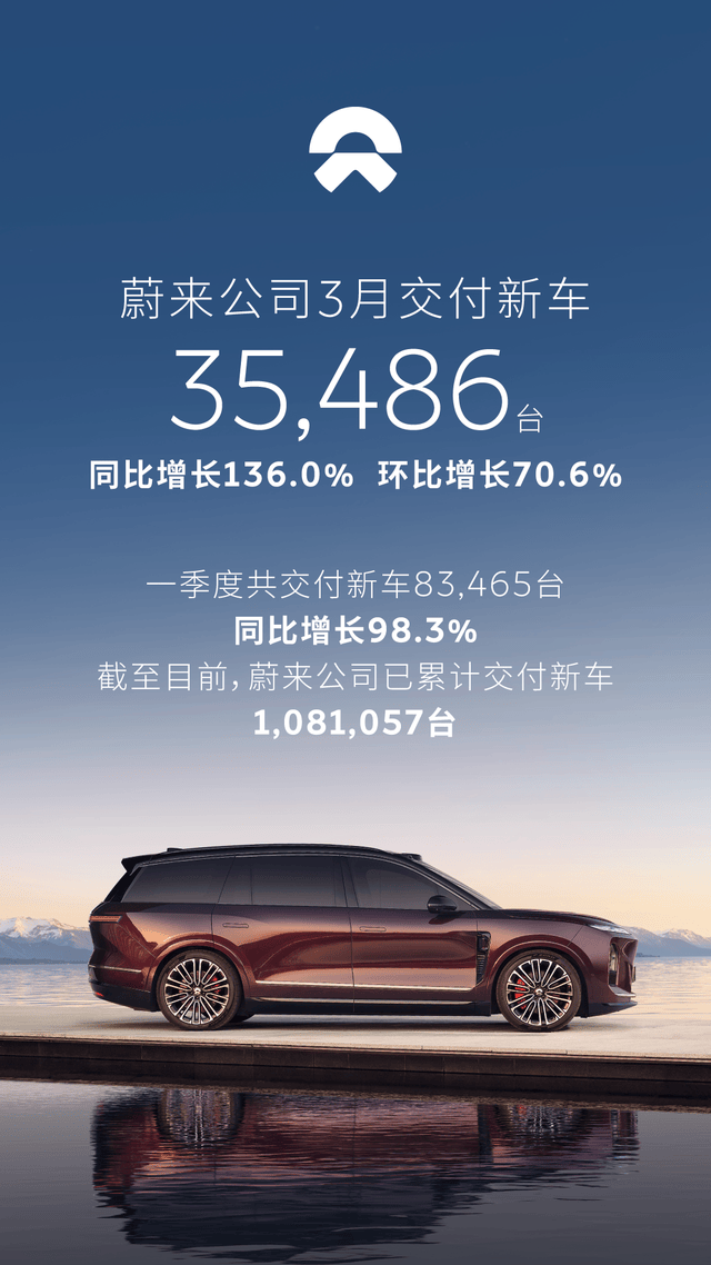 數(shù)據(jù)顯示,蔚來公司單月交付新車35486臺,同比暴漲136.0%、環(huán)比大漲70.6%;一季度累計(jì)交付達(dá)83465臺,同比增長98.3%,一舉超過此前財(cái)報(bào)給出的交付指引上限。