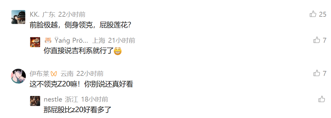 值得一提的是,在新車申報圖曝光后,大家對其外觀的爭議也相當大。有網(wǎng)友就評價:其“前臉像極越,側(cè)身像領(lǐng)克,屁股像蓮花”,設(shè)計語言融合感較強。