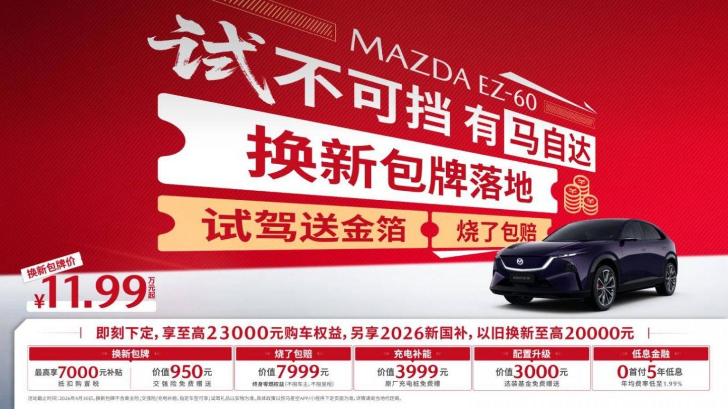 活動截止2026年4月30日,全國長安馬自達門店均可參與。快來預約試駕,拿走屬于你的那份“真金”吧!