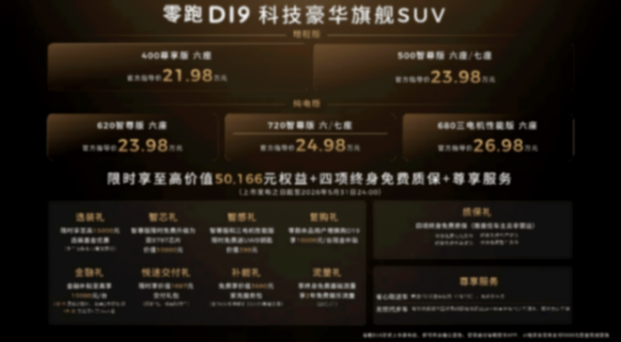 2026年4月16日,零跑旗艦D平臺首款車型——零跑D19正式上市,售價21.98萬元至26.98萬元。新車定位“科技豪華旗艦SUV”,提供增程和純電兩種動力、六座和七座多種版本選擇。即日起至5月31日,下定用戶還可享受多重購車禮遇,限時權益總價值高達50166元。