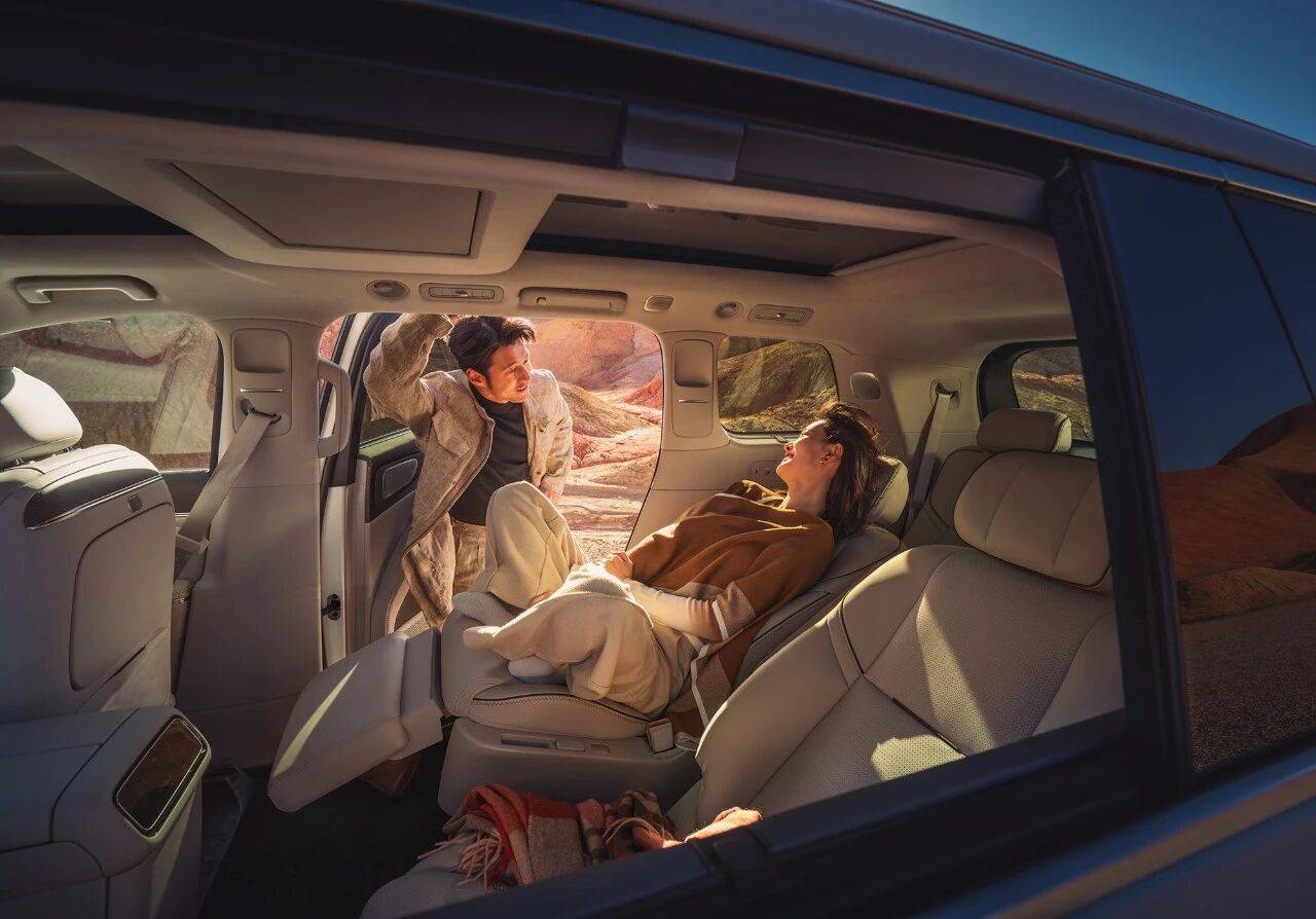 首先,空間足夠大。D19擁有5252×1995×1800mm的超大車身尺寸和3110mm的超長軸距,座艙得房率高達88%。六座版配備195mm同級最寬純平通道,七座版支持多模式一鍵成床。關鍵是,連第三排都能實現131°靠背無極調節和座椅加熱,徹底告別“小板凳”體驗。