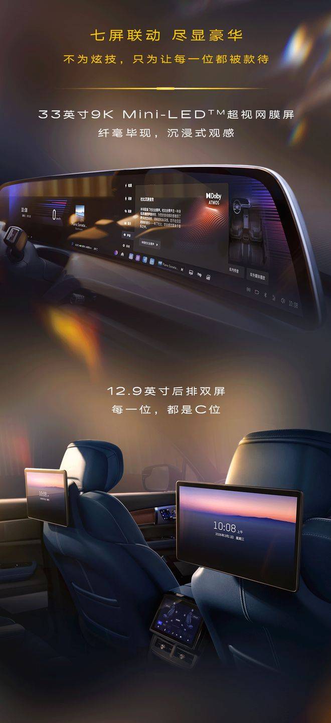 內(nèi)飾采用2+2+2六座布局,第二排為兩個(gè)獨(dú)立行政級電動(dòng)座椅,支持16向調(diào)節(jié)、6向航空頭枕、10點(diǎn)分區(qū)指感按摩及智能加熱通風(fēng)功能,并針對中國用戶體型優(yōu)化坐墊寬度與靠背貼合度。座椅材質(zhì)為北美五大湖區(qū)進(jìn)口Fine Nappa半苯胺真皮,經(jīng)低溫慢染工藝處理,輔以手工浮光繡與法式雙縫線。座艙配備33英寸環(huán)幕式9K超視網(wǎng)膜曲面屏,最多可實(shí)現(xiàn)七屏聯(lián)動(dòng),包括儀表屏、中控屏、中央通道控制屏及二排雙獨(dú)立娛樂屏。音響系統(tǒng)為23揚(yáng)聲器AKG Studio音響,支持Dolby 7.1.4杜比全景聲。