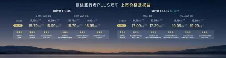 捷途旅行者PLUS提供2.0TDXWD征服、2.0TDXWD征服+兩款配置,官方指導價17.79萬-18.99萬元,置換價15.79萬-16.99萬元;旅行者PLUSC-DM推出129km穿越、211kmXWD征服兩款配置,官方指導價17.79萬-19.99萬元,置換價17.09萬-19.29萬元。