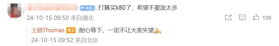 不過,王騰在評論區(qū)回復(fù)網(wǎng)友“打算買k80了,希望不要漲太多”的評論時表示,“堅持價格厚道,耐心等下,一定不讓大家失望”。