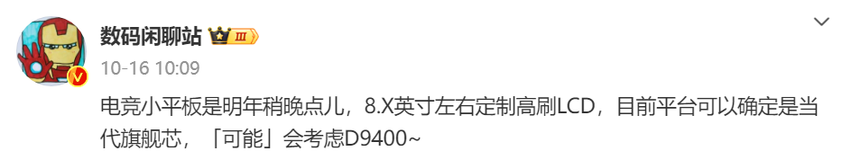 來自同一位博主的爆料顯示,某廠電競小平板“明年稍晚點兒”亮相,配備8.X 英寸左右定制高刷LCD屏、“目前平臺可以確定是當(dāng)代旗艦芯,可能會考慮D9400”。結(jié)合評論區(qū)討論來看,該廠商預(yù)計為小米Redmi。