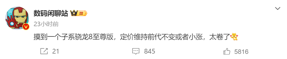 隨后博主@數(shù)碼閑聊站 發(fā)文,“摸到一個子系驍龍8至尊版,定價維持前代不變或者小漲,太卷了”。