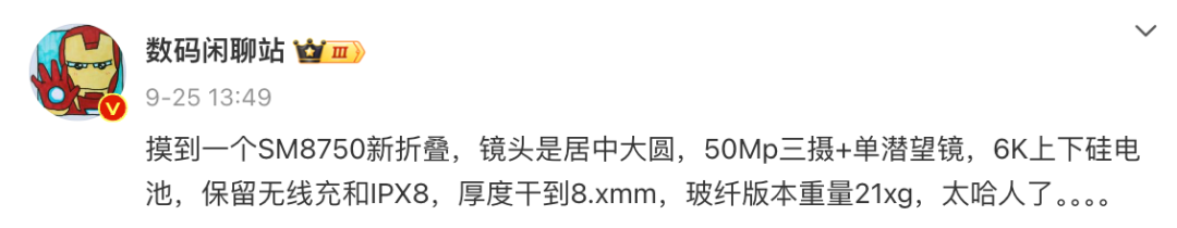爆料中提到:“摸到一個SM8750新折疊,鏡頭是居中大圓,50Mp三攝+單潛望鏡,6K上下硅電池,保留無線充和IPX8,厚度干到8.xmm,玻纖版本重量21xg,太哈人了。。。。”