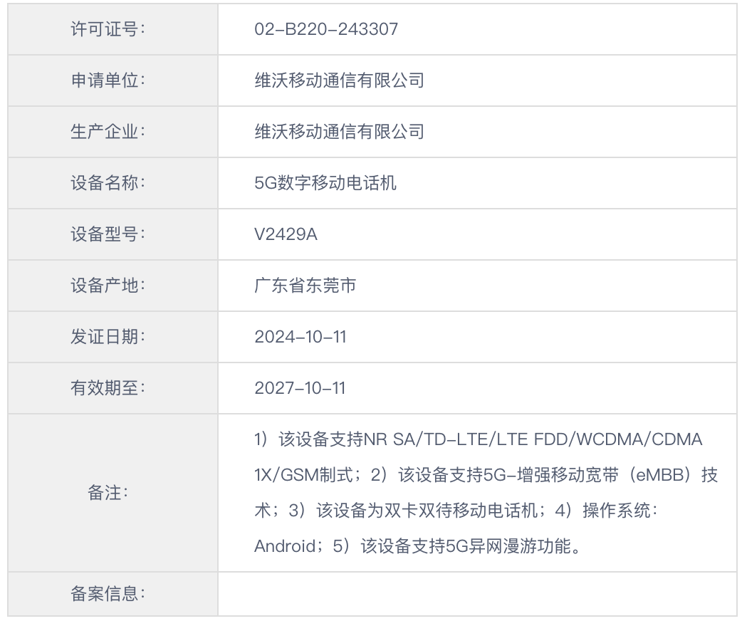 據悉,一款vivo旗下型號為V2429A的手機通過了電信設備入網許可認證。認證信息中沒有顯示更多的產品細節信息,但相關推測認為其應該就是新一代的 vivo X Fold 4 折疊屏手機。