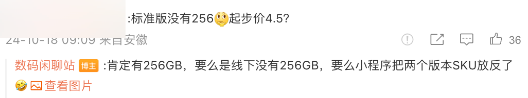 至于爆料中的標準版沒有256GB版本的這一點,相關消息中顯示“肯定有256GB,要么是線下沒有256GB,要么小程序把兩個版本SKU放反了”。