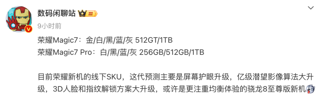 今天,博主@數碼閑聊站 的一份爆料中提到:“榮耀Magic7:金/白/黑/藍/灰 512GT/1TB;榮耀Magic7 Pro:白/黑/藍/灰 256GB/512GB/1TB。目前榮耀新機的線下SKU,這代預測主要是屏幕護眼升級,億級潛望影像算法大升級,3D人臉和指紋解鎖方案大升級,或許是更注重均衡體驗的驍龍8至尊版新機”。