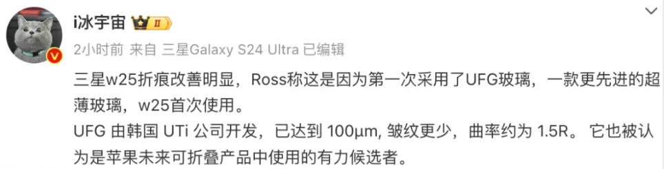 博主@i冰宇宙 曾發文透露:“三星w25折痕改善明顯,Ross稱這是因為第一次采用了UFG玻璃,一款更先進的超薄玻璃,w25首次使用。UFG 由韓國 UTi 公司開發,已達到 100μm, 皺紋更少,曲率約為 1.5R。它也被認為是蘋果未來可折疊產品中使用的有力候選者。”