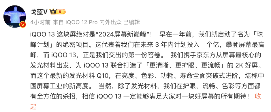iQOO 產(chǎn)品經(jīng)理 @戈藍(lán)V 對(duì)此表示:“iQOO 13 這塊屏絕對(duì)是‘2024屏幕新巔峰’! 早在一年前,我們就啟動(dòng)了名為「珠峰計(jì)劃」的絕密項(xiàng)目。這代表著我們?cè)谖磥?lái) 3 年內(nèi)計(jì)劃投入十個(gè)億,攀登屏幕最高峰,而 iQOO 13,正是我們交出的第一份答卷。”