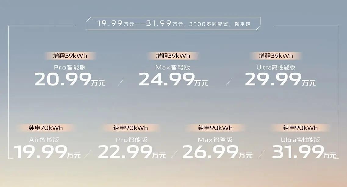 在動力續(xù)航部分,增程式版本1.5T發(fā)動機,最大功率150馬力,匹配的則是后置單電機或前后雙電機組成的電控四驅(qū)系統(tǒng)。電機功率分別為314馬力和492馬力,標(biāo)配39千瓦時大電池,純電續(xù)航里程最高245公里,綜合續(xù)航里程1200公里。能夠保證遠途出行。