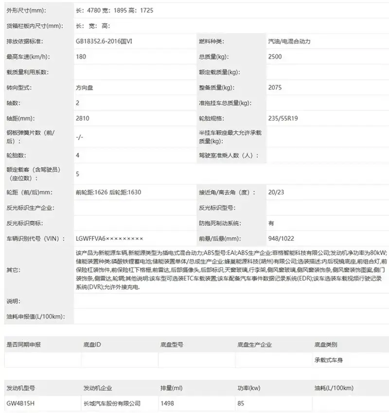 目前的內(nèi)飾部分還沒(méi)有爆出,但是動(dòng)力上是搭載了長(zhǎng)城Hi4智能四驅(qū)電混系統(tǒng),1.5t的發(fā)動(dòng)機(jī)將驅(qū)動(dòng)電機(jī)組成發(fā)動(dòng)機(jī)最大功率85kW,匹配的是蜂巢能源的磷酸鐵鋰的電池組工信部爆出來(lái)的純電續(xù)航為126km,虧電油耗是5.35L每百公里。