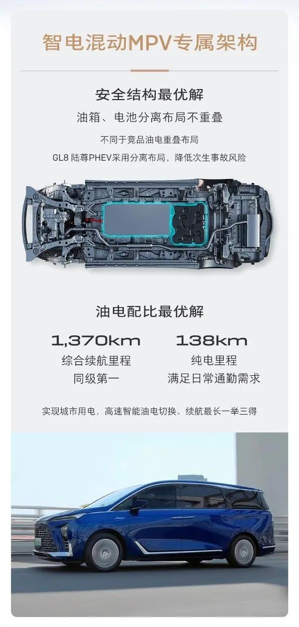 與傳統車企轉向新能源車企不同的是,別克這次并未敷衍消費者,而是采用的專屬的新能源架構,縱向布置的電池包不侵占地板空間、也不需要加高車身,使得GL8 PHEV的體型非常克制,安全性、穩定性不受影響,電池包的重量也不會給輪胎、懸架帶來壓力。這是目前別克GL8備受好評的一點。