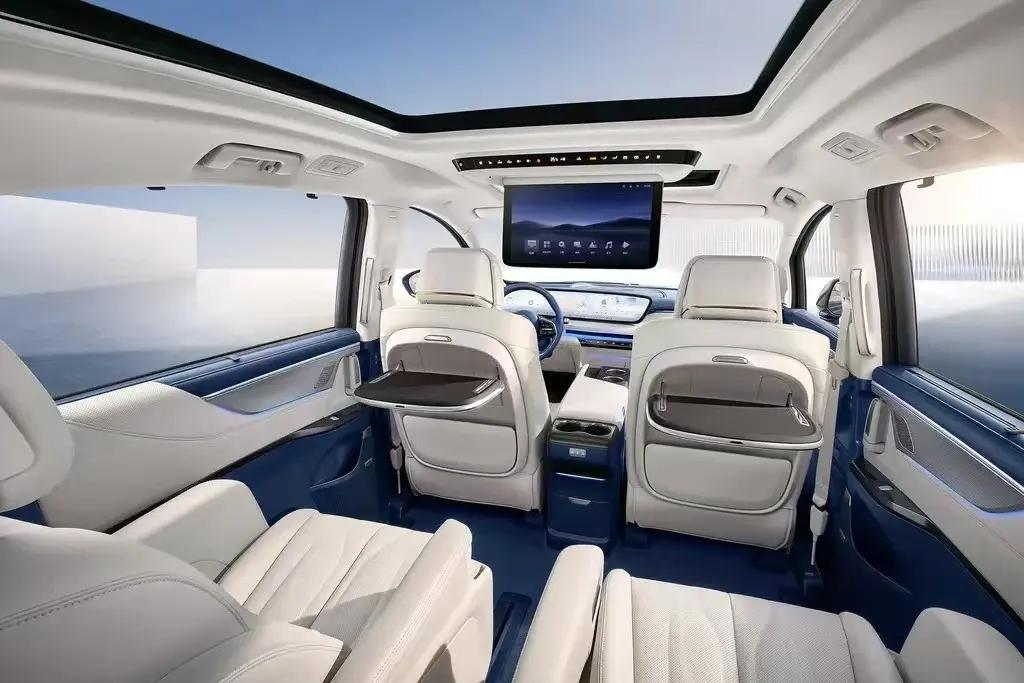 在內飾配置上,GL8 PHEV搭載了15.6英寸智能后排吸頂屏幕以及前排的30英寸的大連屏,配備了電動側滑門、迎賓光毯、雙層隔音玻璃、后排隱私玻璃、遮陽簾等,儀式感還是有的,包括后排的小桌板還是一應俱全,整體內飾的豪華感還是不錯的。