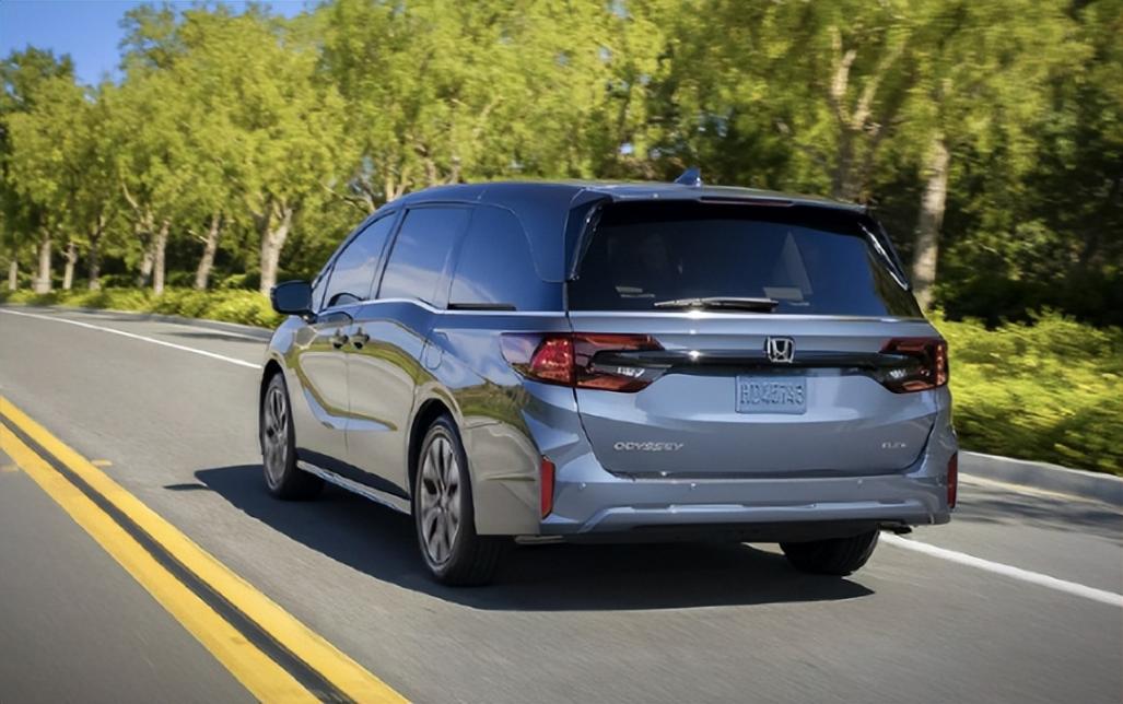 尾部來看,我們熟悉的C型樣式的大燈被尖銳的熏黑尾燈進行了取代,尾部的層次感也更加鮮明。此外,從后部我們發現2025款本田奧德賽明顯變得更加寬體。