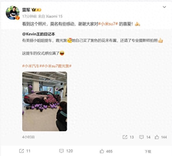 12月4日消息,博主Kevin王的日記本發微博表示,一位美麗小姐姐提小米SU7霞光紫,她自己買了紫色的花來布置交付現場,還請了專業的攝影師拍照,儀式感拉滿。
