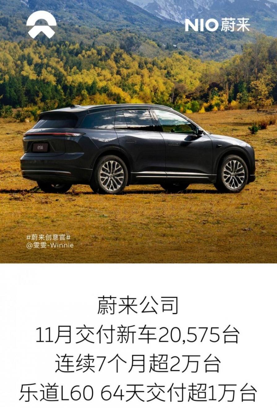 蔚來汽車: 11月交付20575輛