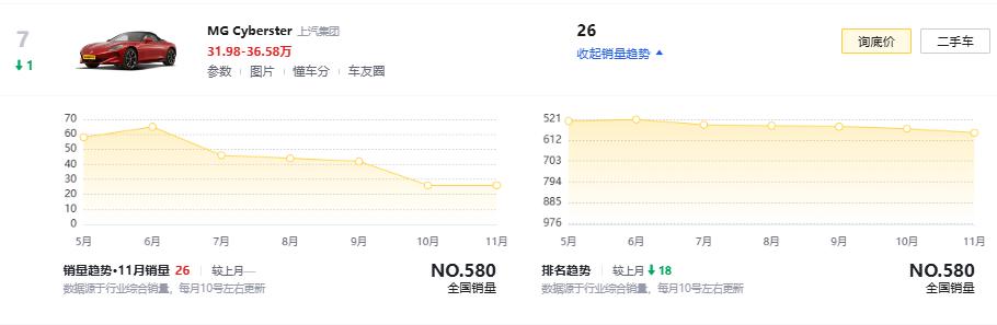 在這之前,國內并不是沒有新能源敞篷車,比如五菱宏光MINIEV敞篷版、MG Cyberster,其中MG Cyberster仍然在售,不過銷量表現的確不佳,11月僅售出26臺。