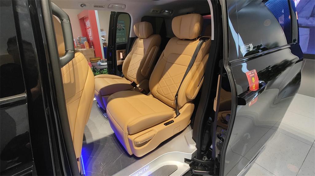 除了最低配要加3000塊錢選裝之外,其它的配置都帶有電動側滑門和帶記憶功能的電動尾門。側門的門檻上帶有階梯設計,本身地臺也比較低,便于老人小孩上下車,這也是標準操作了。側滑門上帶有手動的遮陽簾。門板上的扶手做成了如同宮燈一般形狀的氛圍燈,造型很別致,這也是傳祺E8+的新增配置,只是不能像極氪MIX那樣拆下來當露營燈用。