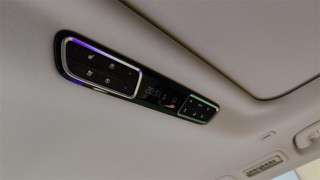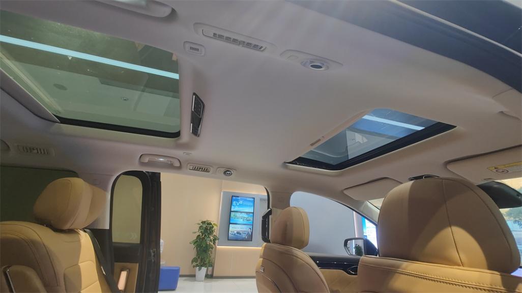 車頂的天窗被分為了前后兩部分,只有前排頭頂的是可以開啟的,二排頭頂的只是單純的天幕,不過前后都帶有獨立的電動遮陽簾;另外前排天窗的滑軌從內部來看沒有做遮擋措施,移動的滑軌和潤滑的油脂直接暴露在視野里,顯得不夠考究。