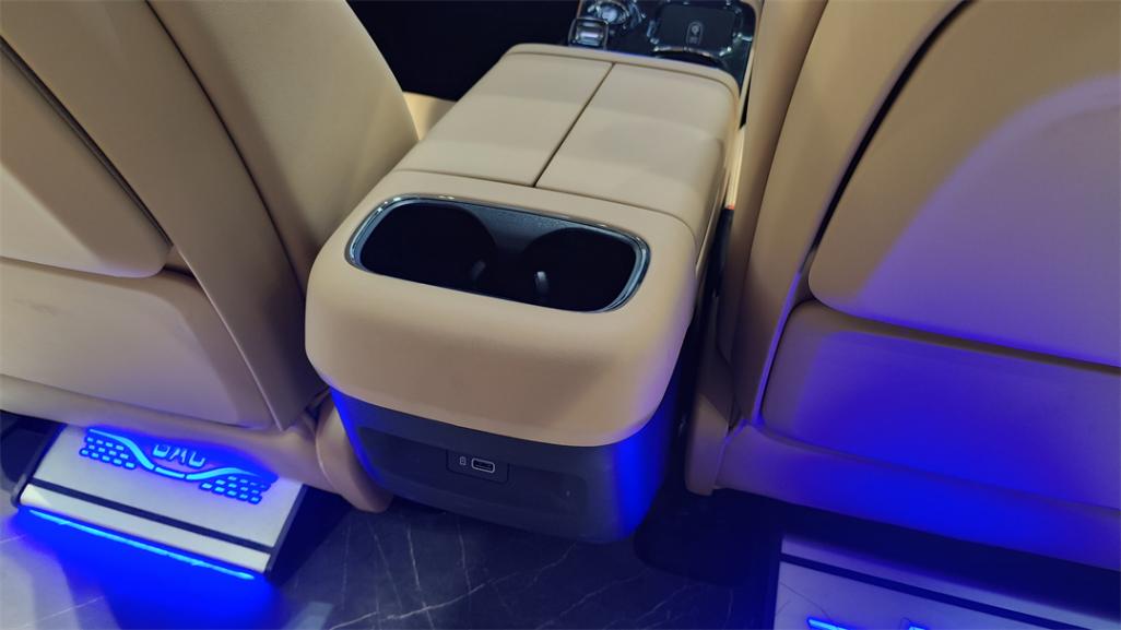 二排前方的Console區域,上方帶有雙杯架,但中間的部分只有一個Type-C充電口,缺少通用性更強的Type-A口,而下方的部分則有一個明顯的向內凹陷,用于形成腳部空間的避讓,同時也可以作為預留后裝冷暖箱的位置,不過可用的容積不大。也就是說,想要“冰箱彩電”,基本都得靠4S店附贈的“原廠精品”或者自己后裝。