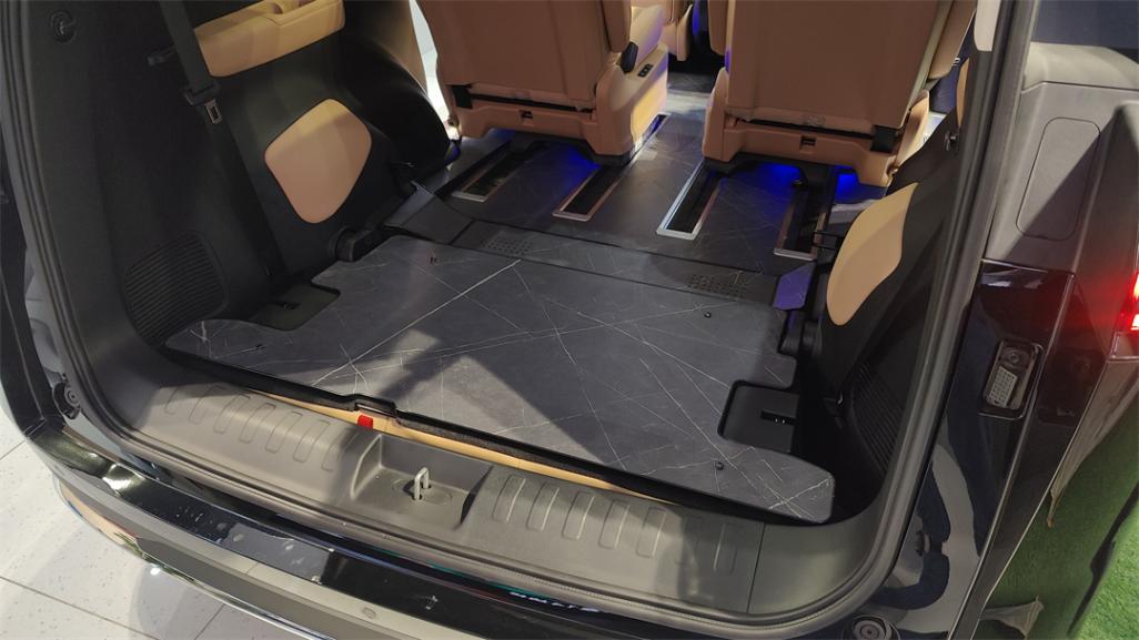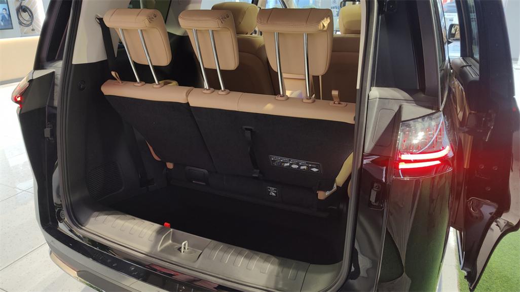 三排座椅的收納方式,也是很“日系”的結構形式。將靠背折疊后整體向下隱藏在地臺下方,不但獲得一個平整的加大行李廂,常規狀態下的尾廂空間也有一定保證,345L的容積塞兩個登機箱問題不大。