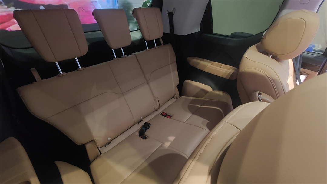 三排座椅的優勢依然體現在人機布局上,坐墊的角度做了一定的向后傾斜,以保證對大腿的承托能力,瘦高形狀的頭枕也能盡可能延長對后背的支撐。用我自己1.74米的身高實測,在二排座椅往前移動、保留大約一拳的空間之后,第三排也能有將近一拳左右的腿部空間。