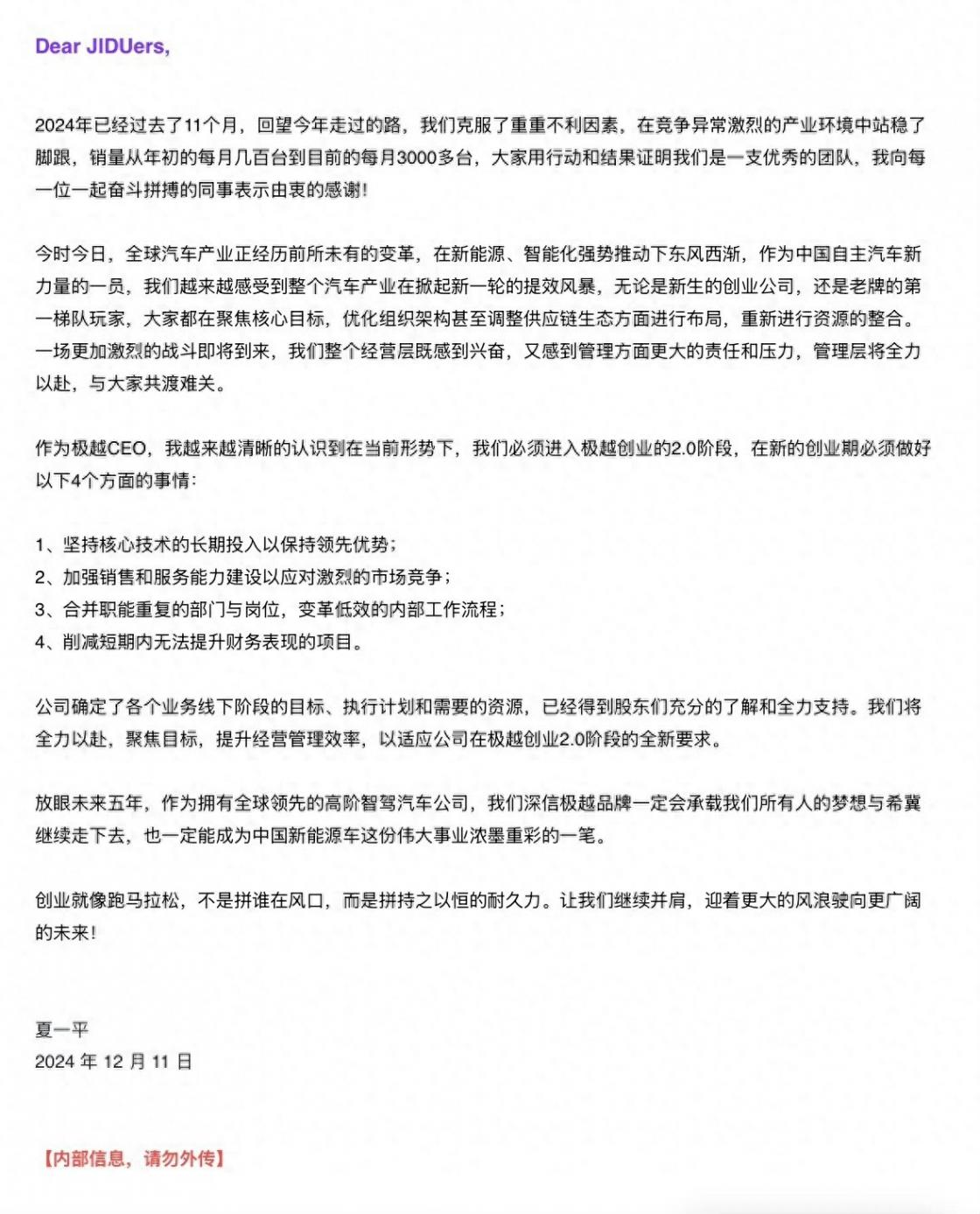極越這幾天處于風口浪尖,各種謠傳都有。但是夏一平發布的內部信似乎辟謠了所謂“原地解散”的事情,主要是提出了要進入極越創業2.0階段。內部信主要提到了幾點:第一要堅持長期投入,第二加強銷售和服務部門,第三合并重復部門和崗位;第四削減不能掙錢的項目。