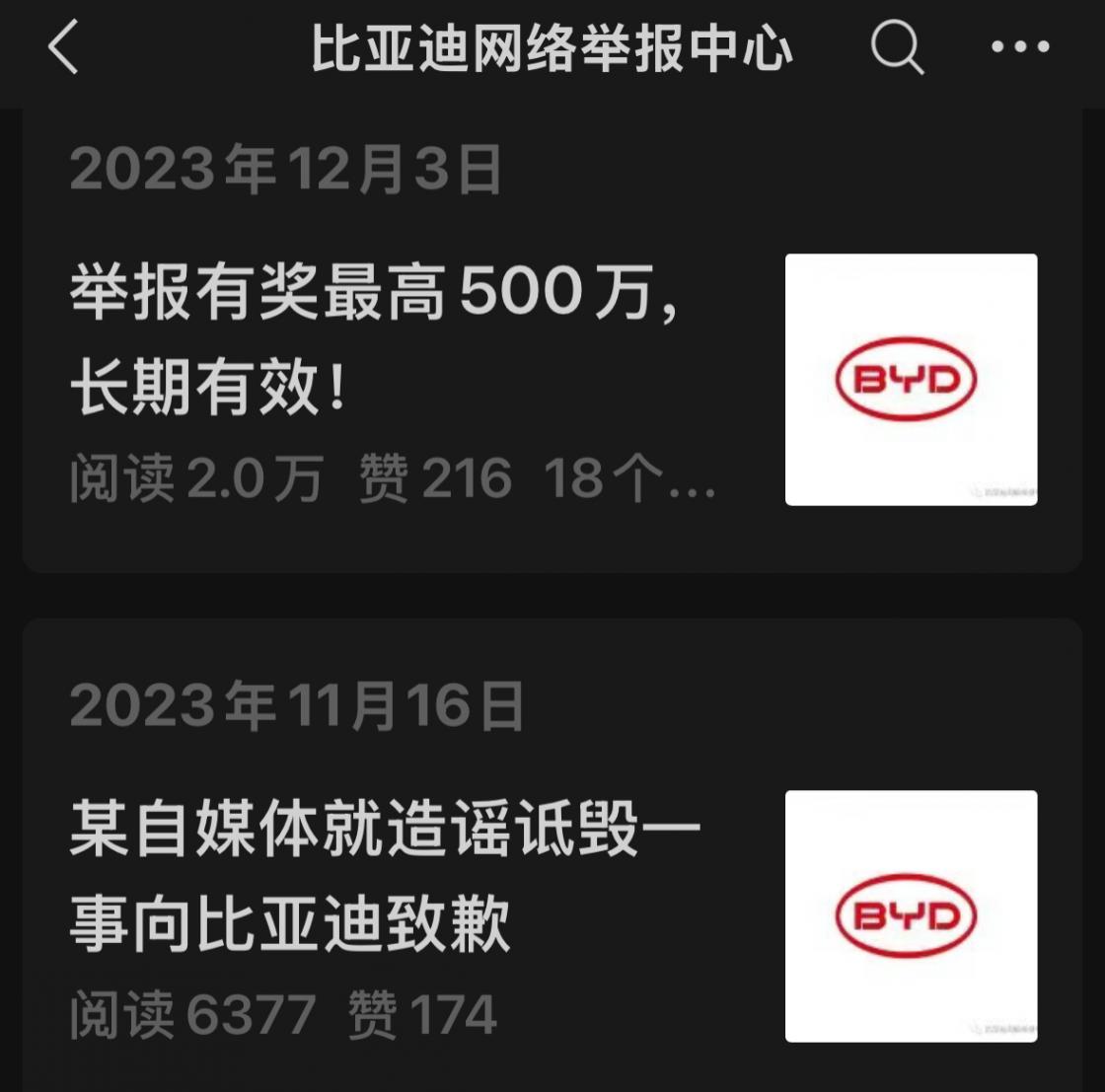 我們留意到,在相關社交網絡上,很多人轉發李云飛這條視頻號之后,都會跟著一條轉發文章:來自于2023年12月3日的“比亞迪網絡舉報中心”公眾號,標題為: