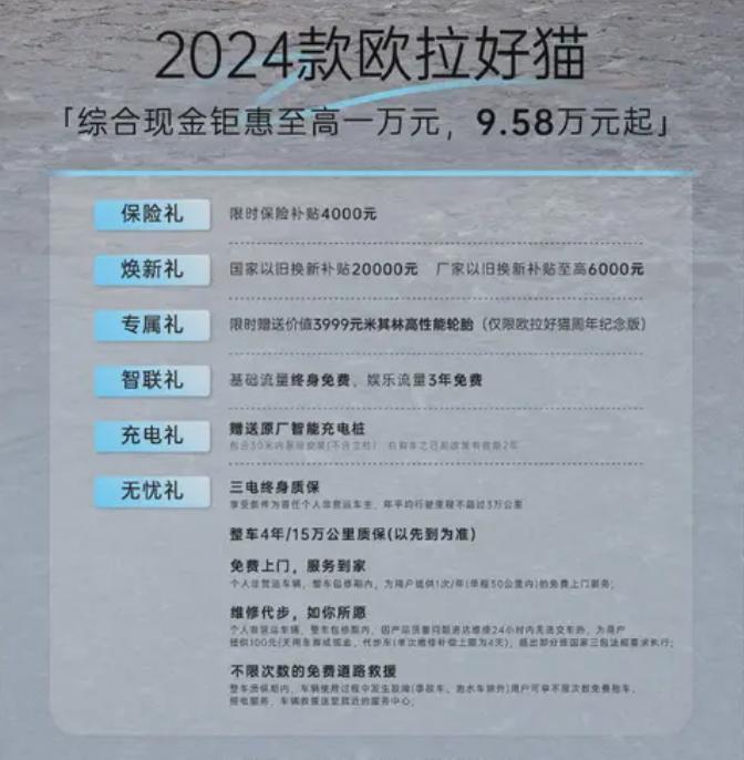 簡單來了解一下,歐拉汽車官方發布的公告上注明,2024款歐拉好貓可享綜合現金優惠至高1萬元,算下來入門款401km舒享型入手門檻降到了9.58萬元。此外,官方還限時贈送4000元保險補貼,針對歐拉好貓周年紀念版車型,還額外贈送價值3999元的米其林高性能輪胎。此外還包括了三電終身質保、整車4年/15萬公里質保。(以上價格信息僅供參考,詳情建議以當地經銷商報價為準)