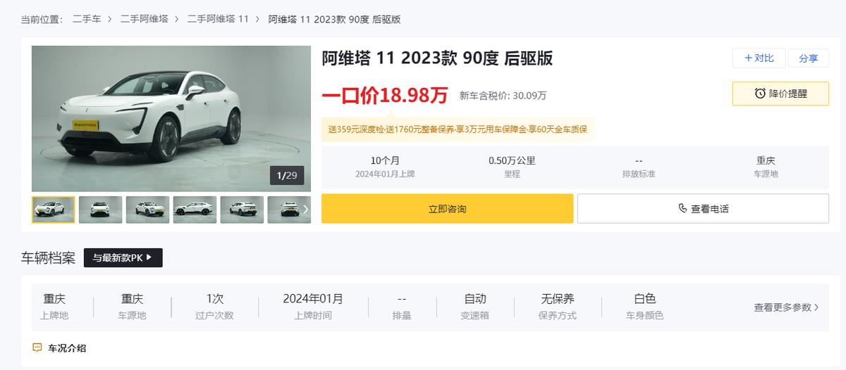 而今回過頭來看,阿維塔 11在二手車市場上的保值率并不好看,這可能主要是因為阿維塔品牌并不在華為鴻蒙智行矩陣中,在智駕方案和座艙智能化體驗方面,版本落后于問界、享界、智界等品牌車型。著眼于前,二手車市場上有一款行駛里程0.5萬公里的2023款阿維塔 11可供參考,具體車型為90度 后驅版,新車含稅價30.09萬元,如今上牌已有10個月,售價18.98萬元,不到一年的時間,車價下探11.11萬元。