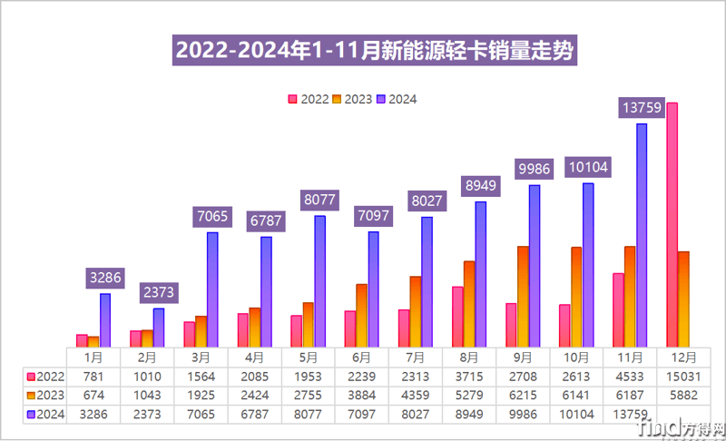 從2024年1-11月新能源輕卡銷售走勢可見,三季度呈現直線上升走勢,這與過去兩年同期走勢基本相同,但單月銷量幾乎每個月都是翻倍增長。
