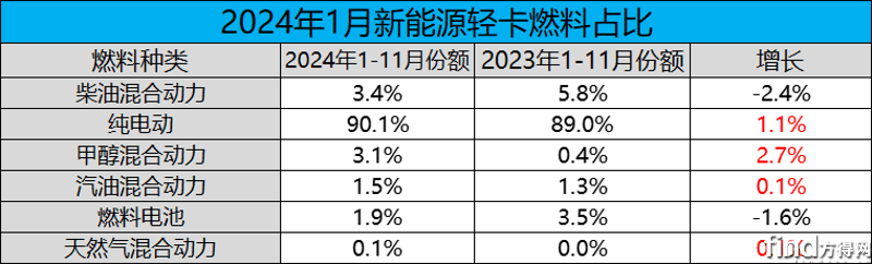 2024年1-11月,新能源輕卡車型燃料分布也有較大變化。其中,純電輕卡銷售7.7萬輛,相比2023年份額增長1.1%。混動輕卡中,甲醇混動輕卡增長最大,份額同比去年增長2.7%,天然氣混合動力輕卡的份額也增長0.1%。