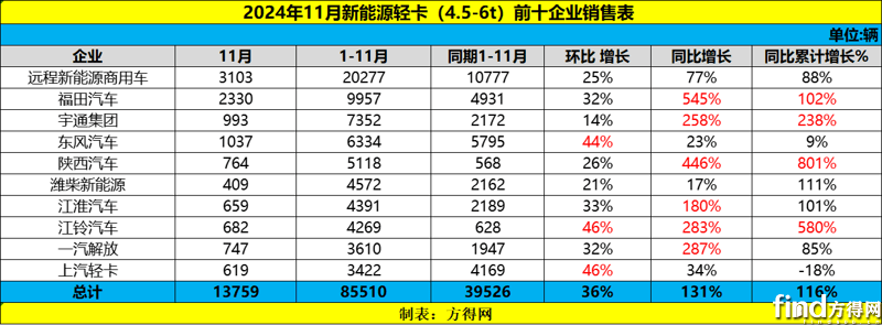 2024年11月,新能源輕卡銷量13759輛,同比增長131%,2024年1-11月,新能源輕卡銷量8.6萬輛,同比增長116%。