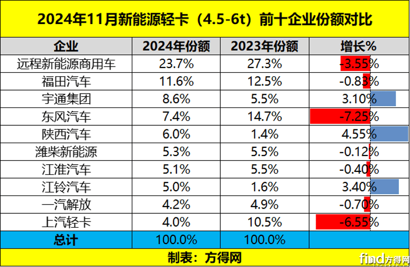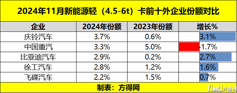 相比2023年11月,2024年11月,新能源輕卡前十榜單,前五企業位次變化較大,前十同樣有更迭。