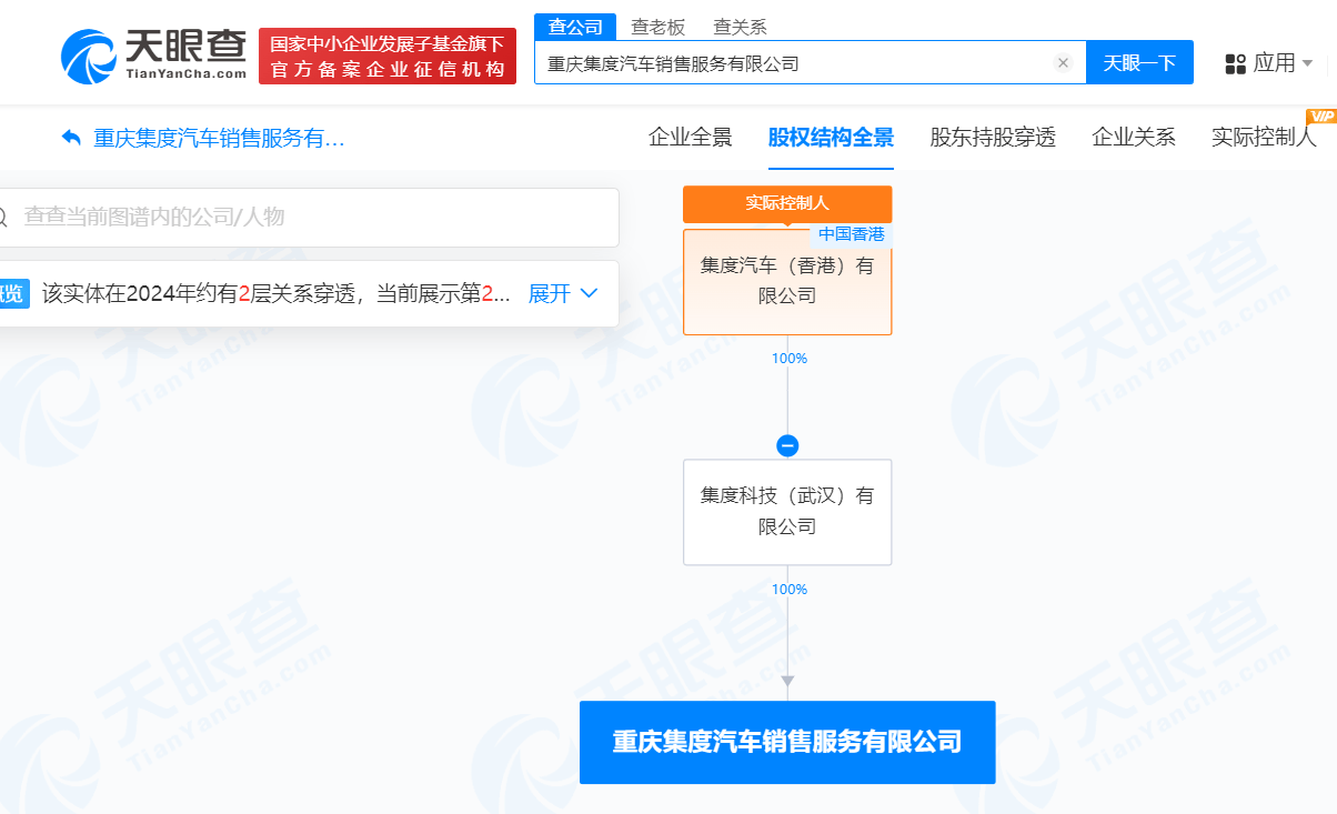進一步股權穿透分析顯示,重慶集度汽車銷售服務有限公司為集度科技(武漢)有限公司的全資子公司,而集度科技(武漢)有限公司則隸屬于集度汽車(香港)有限公司。這一系列股權結構揭示了公司背后的強大資本支持和國際化的運營背景。