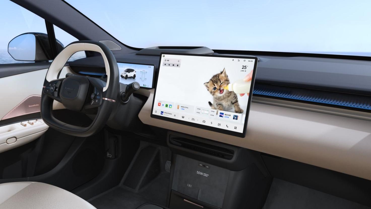 再看看車?yán)镱^。領(lǐng)克Z20的內(nèi)飾設(shè)計走的也是簡約風(fēng),沒有太多花里胡哨的東西。中控臺層次分明,大尺寸的中控屏科技感十足。