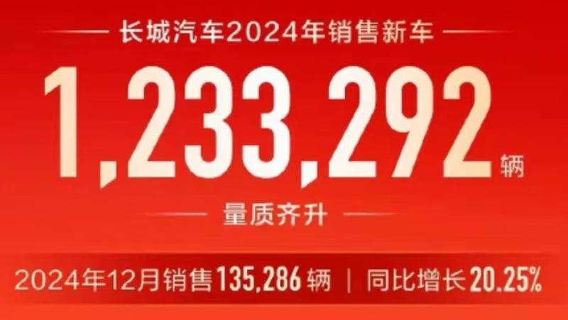 長城汽車2024年12月銷量為135286臺,同比增長20.25%;全年累計銷量為1233292臺,同比增長0.21%。其中12月海外出口41293臺,1-12月累計銷量為453141臺;12月新能源汽車銷量為42265臺,1-12月累計新能源汽車銷量為321795臺。