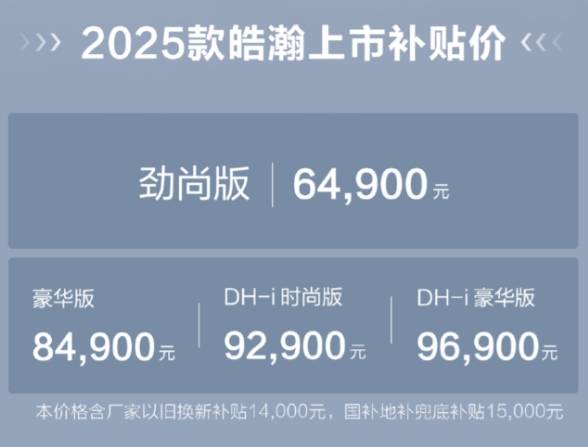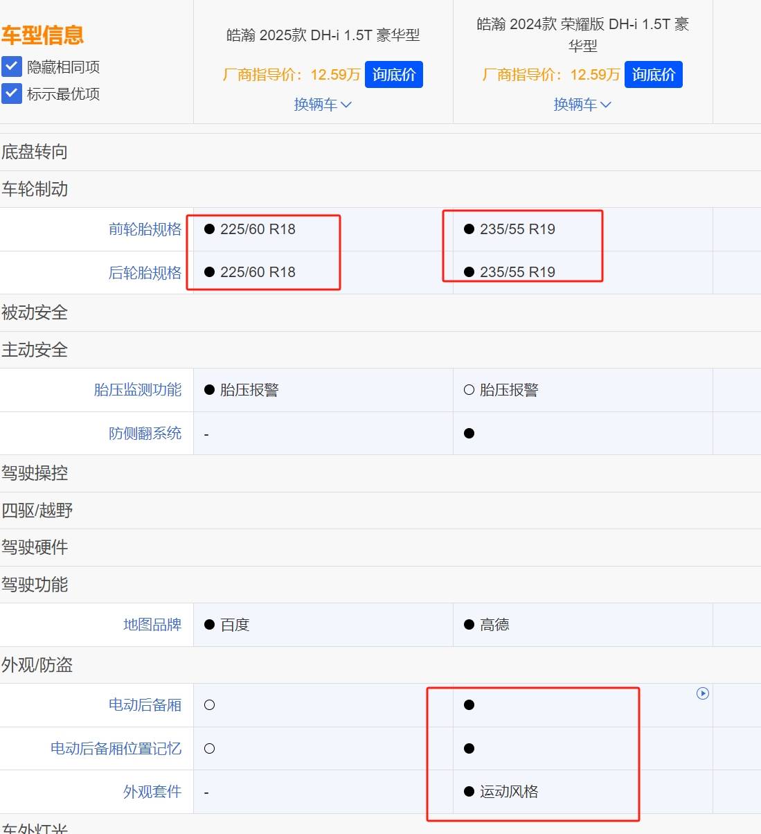 不過和2024款車型相比,新款車型和24款車型的配置也有所調(diào)整,既有增配,也有減配。比如以同為指導(dǎo)價12.59萬的2025款皓瀚 DHi豪華型和2024款DHi豪華型為例,新車增配了胎壓報警、外后視鏡加熱、自動折疊等功能。