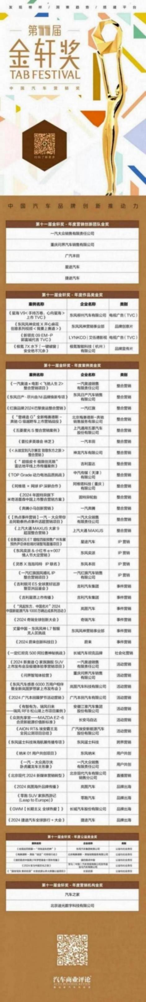 金軒獎,由汽車商業(yè)評論與知萌咨詢機(jī)構(gòu)聯(lián)合發(fā)起創(chuàng)立,首屆金軒獎啟動于2014年。十年來,金軒獎?chuàng)窀叨?,推動汽車營銷向前進(jìn),涵蓋了汽車營銷的全鏈路,得到了廠商的持續(xù)支持。