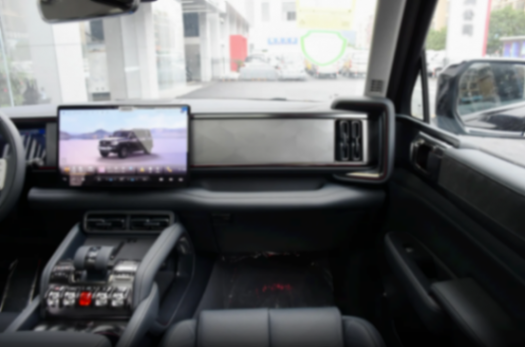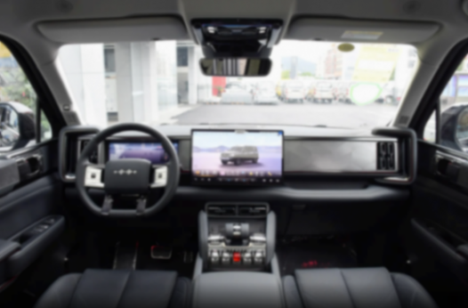 進入車內,整個中控臺的設計元素就是“大”,看上去比較復雜,黑色的配色和仿金屬飾板搭配,既彰顯硬派感又突出科技感。加上車門兩邊采用了鎖環式扶手及鎖環式門扣的設計,流露出硬派氣息。而為了體現豪華感和科技感,新車采用了時下流行的三屏設計,分別為15.6英寸2.5K高清中控多媒體屏,12.3英寸全液晶儀表屏和12.3英寸副駕多媒體娛樂屏,并搭載Filink智能座艙。而四幅式方向盤的設計也符合它硬派SUV的定位,擁有不錯的握持感。