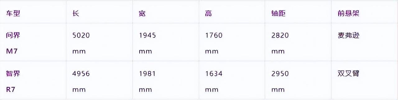 但是在關鍵的軸距參數上,問界M7只有2820mm,比智界R7短了130mm,這個差異很關鍵,因為它反映出兩款車型在平臺方面的差異。