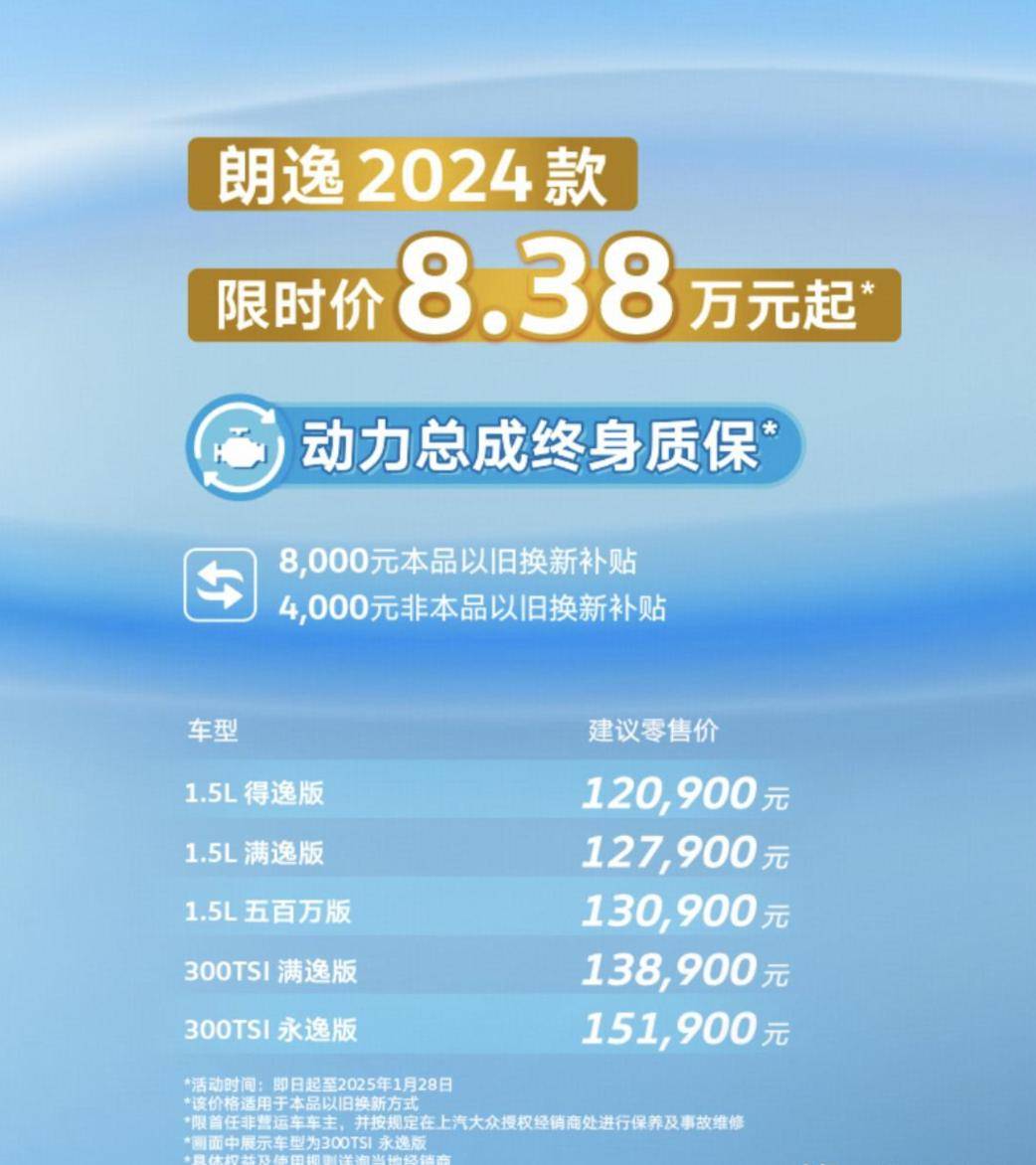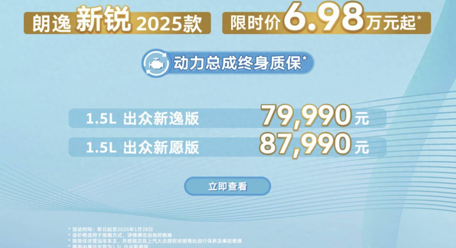 但現(xiàn)在優(yōu)惠政策有所不同了,上汽大眾在1月份推出了“限時一口價”,截止2025年1月28日:2025款朗逸新銳限時價為6.98萬元起,此外,2024款朗逸限時價為8.38萬元起(該價格適用于按揭方式),并且享受動力總成終身質(zhì)保等權(quán)益。
