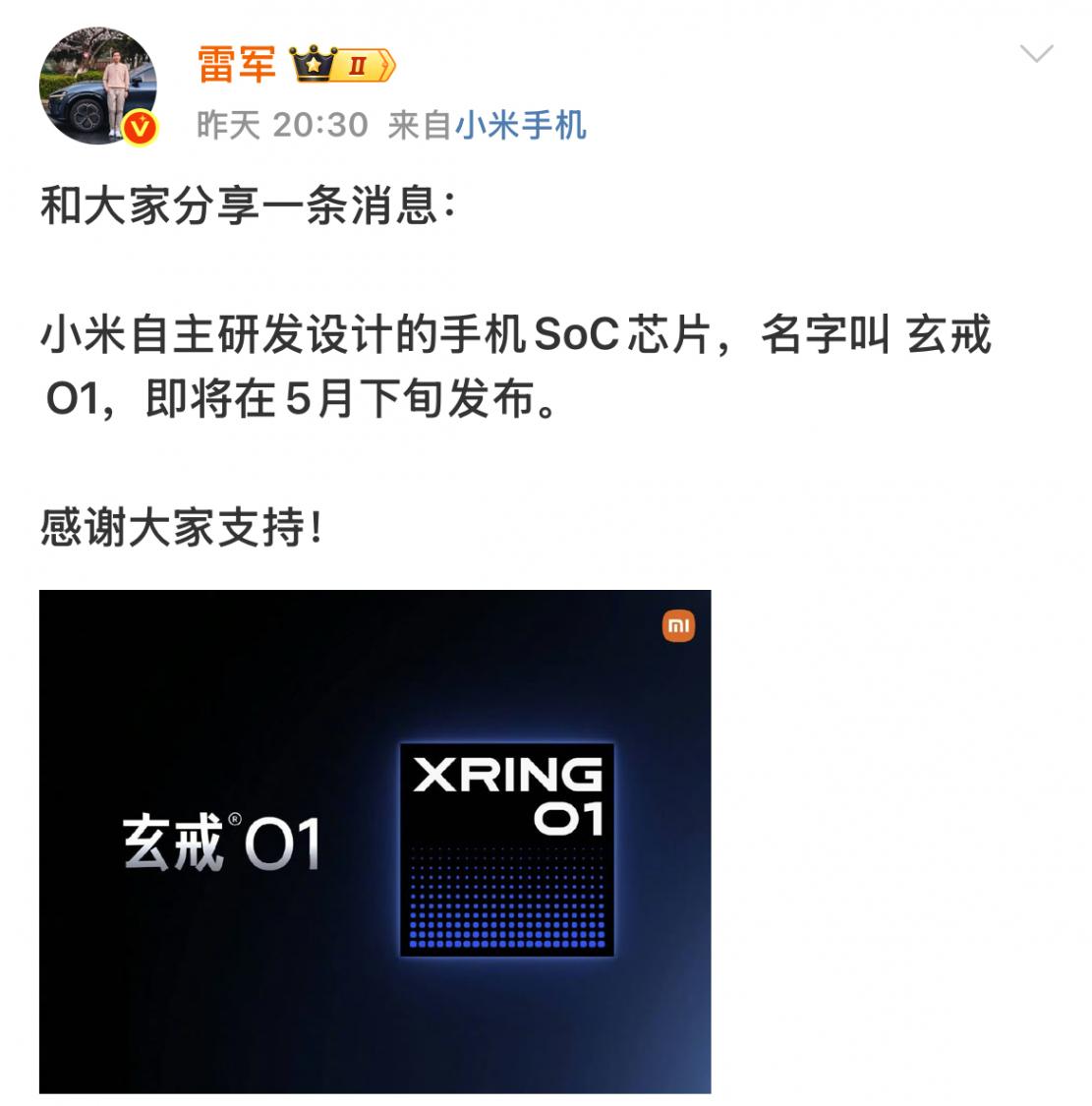 15日,雷軍發文稱,小米自主研發設計的手機SoC芯片,名字叫玄戒O1,即將在5月下旬發布。