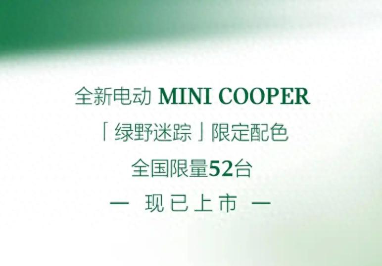 此次電動MINI COOPER推出綠野迷蹤限定配色,不僅是一次簡單的車型升級,更是對品牌個性與時尚追求的進一步詮釋。限量52臺的稀缺屬性,讓每一輛擁有它的車主都能成為獨特的存在。如果你是MINI的忠實粉絲,或是追求個性、時尚的有車一族,那么這款綠野迷蹤限定配色的電動MINI COOPER絕對值得你關注,它將帶你開啟一段與眾不同的駕駛之旅 。