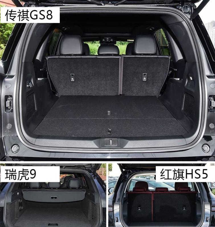 空間方面,傳祺GS8最長最有優勢,車長接近5米,軸距接近3米。后排坐三個成人沒問題,中間位置也不憋屈。后備箱比另外兩臺大不少,放二十個行李箱應該能裝下。后排座椅還能完全放平,變成一張床,適合露營。瑞虎9后備箱雖然也能展開到1780升,但沒分層設計,裝零碎東西不太方便。紅旗HS5后備箱最小,后排地臺中間凸起高,放東西容易被擋住。